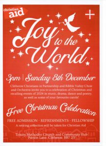 Advent events with Clitheroe Christians in Partnership Saturday November 30th Fully booked! But there’s still room at Joy to the World 3pm on Sunday December 8th at Trinity Methodist Church 29th November 2024 Uncategorised No comments Patricia Duxbury