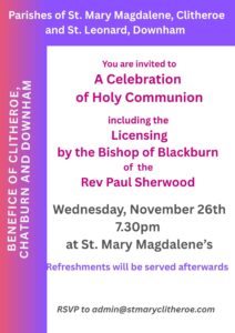 The Churchwardens and PCC of St. Mary Magdalene Clitheroe and St. Leonard’s Downham invite you to a Celebration of Holy Communion including the licensing of the Rev Paul Sherwood to his ministry in our two parishes.